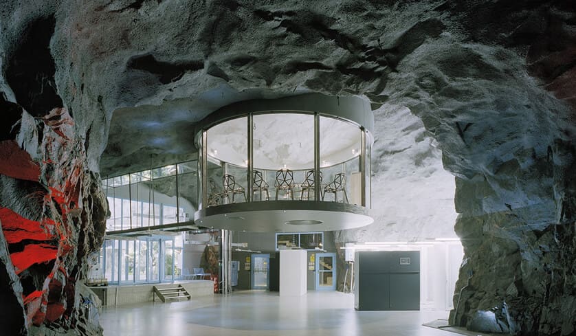 The brainchild of leading Swedish architects Albert France-Lanord (AF-L), known for their “permanent need to experiment”, the futuristic cave that is Pionen is fully furnished in 007 style, with suspended glass corridors, a ‘floating’ conference room, designer furniture and lunar landscape flooring, not to mention two German V12 diesel submarine engines on standby for backup power.