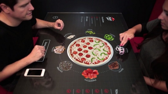 Pizza Hut is collaborating with Chaotic Moons Studio to work on a device that will change the face of food industry forever. Much the same as playing with a tablet or smartphone, the interactive tabletop lets customers build their own pizza by checking what garnishes they might fancy, and pay for it using a smartphone.